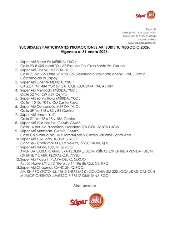 Súper Aki cuenta con sucursales en los estados de Yucatán y Quintana Roo, con muy buena ubicación y estacionamiento propio para que los clientes tengan toda la comodidad al ir a comprar y disfruten de todos los servicios que les ofrece Súper Aki.