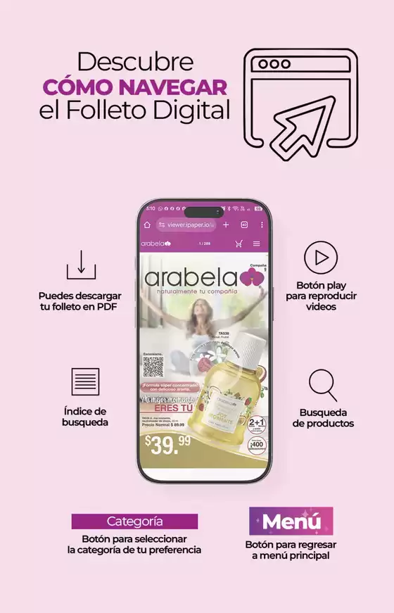 Todas las mujeres se rinden ante la marca Arabela, líder en productos de belleza. Arabela tiene para usted: fragancias y aromas, salud, lencería, cuidado personal, bisutería, maquillaje, complementos nutricionales, ropa y complementos para todos los gustos y todas las edades; en resumen: tiene todo para que luzca increíble.