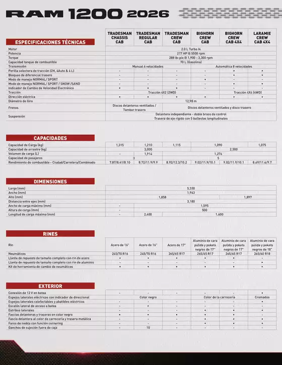 Ram cuenta con modelos de lujo como Ram 1500 Mild-Hybrid Limited, Ram 2500 HD Limited, Ram 1500 Mild-Hybrid Longhorn; modelos deportivos: Ram 1500 Mild-Hybrid Laramie Sport, Ram R/T, Ram Hemi Sport; y modelos comerciales: Ram 700 SLT, Ram ST, Ram SLT, Totalmente Nueva Ram 2500 HD SLT, y Ram Promaster.